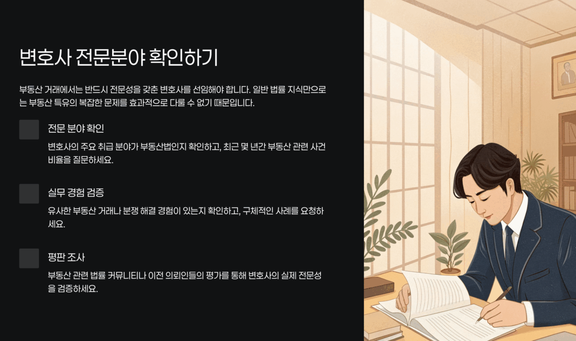 부동산 거래에서는 반드시 전문성을 갖춘 변호사를 선임해야 합니다 단순히 법률 지식만 있다고 해서 부동산 문제를 효과적으로 처리할 수 있는 것은 아니기 때문입니다 변호사의 실제 전문 분야, 경력, 주요 업무 사례 등을 확인하여 부동산 법률 전문성을 판단해야 합니다