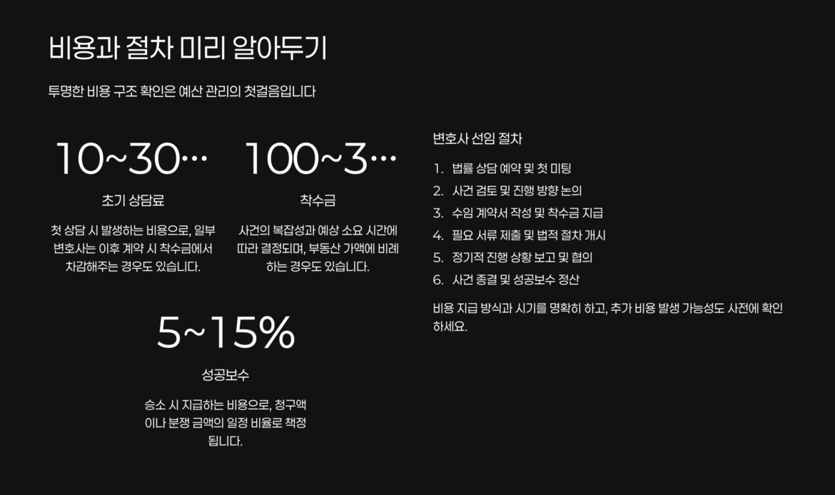 변호사 선임 시 비용과 절차를 미리 확인하는 것은 필수입니다 초기 상담 비용, 착수금, 성공보수 등 세부적인 비용 항목과 변호사의 업무 처리 절차를 사전에 명확히 알아두면 예산 관리와 시간 절약에 큰 도움이 됩니다