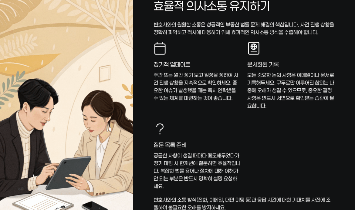 변호사와의 효율적인 의사소통은 사건 해결에 매우 중요합니다 상호 간의 의견을 명확하게 전달하고, 문서와 전화, 이메일 등 다양한 수단을 적극 활용해 사건 진행 상황을 주기적으로 체크하며 문제를 미리 예방하는 것이 필수입니다