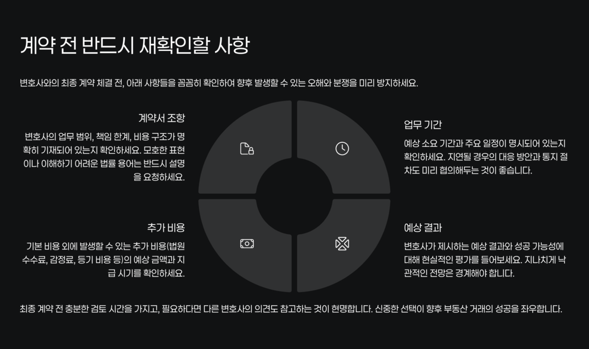 최종 변호사와 계약하기 전 반드시 확인해야 할 사항이 있습니다 계약서의 구체적인 조항들, 변호사의 책임 범위, 업무 수행 기간, 예상 결과 등에 대해 최종적으로 재확인하여 오해와 분쟁을 미리 방지하는 것이 중요합니다